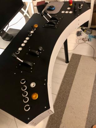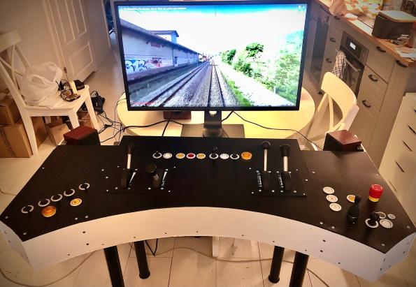 Różne wersje i etapy budowy uniwersalnego pulpitu maszynisty inspirowanego kabiną lokomotywy „Griffin” firmy „Newag”. Pulpit pracuje na dwóch kontrolerach „Leo Bodnar” – BU0836X, które obsługują przyciski sterownicze, przełączniki i potencjometry kontrolerów dźwigniowych.